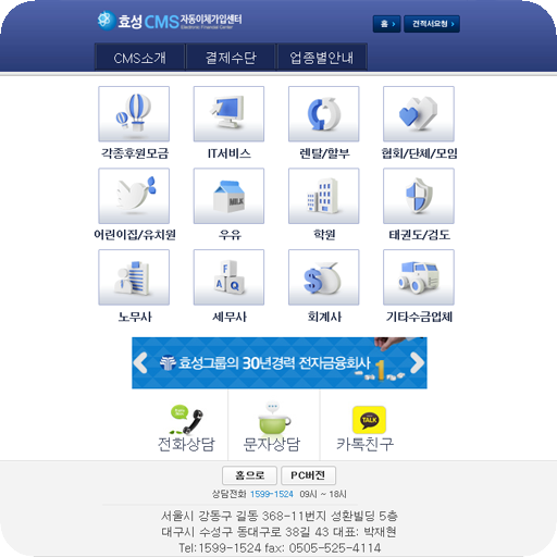 효성CMS자동이체 효성CMS는 번거로운 수납업무를 신속하고 편리하게 처리할 수 있는 자금집금서비스입니다. 거래은행과의 금융업무를 데이터 송수신에 의하여 처리하고, 재무/회계 등의 기간 시스템과 연계할 수 있어, 은행방문 없이 수금된 자금을 관리하고, 입금확인업무를 수행할 수 있습니다. 연락처: 1599-1524 담당자: 김문호 010-4508-4448